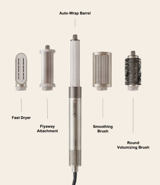 5 alat styling : Auto wrap barrel, Smoothing Brush, Fast Dryer, Round Volumizing Brush, dan Flyaway Attachment